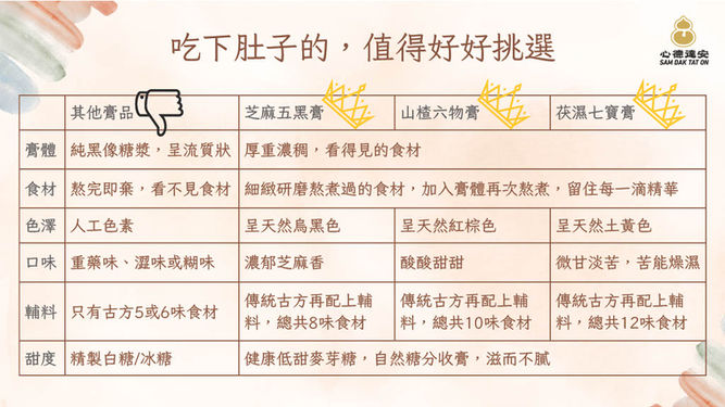 目前皇牌養生產品有《芝麻五黑膏》、《山楂六物膏》及《茯濕七寶膏》,三款膏方均採用傳統中醫養生古方配製,由澳門註冊中醫師根據現代都市人體質,加入多種藥食同源的輔料,再經過8道古法工序提煉而成,包括選材、浸泡、文火慢熬、壓榨、過濾、研磨成蓉、慢熬濃縮、收膏。 產品定位面向本地市民及遊客,為了強調澳門作為中醫藥大健康發展基地以及世界文化遺產集中地的兩大角色,我們在包裝上融入了澳門的標誌性世遺:大三巴、媽祖閣以及哪吒廟,與傳統藥食同源的食材插畫相映生輝。澳門品牌,質量保證;真材實料,送禮佳品。
